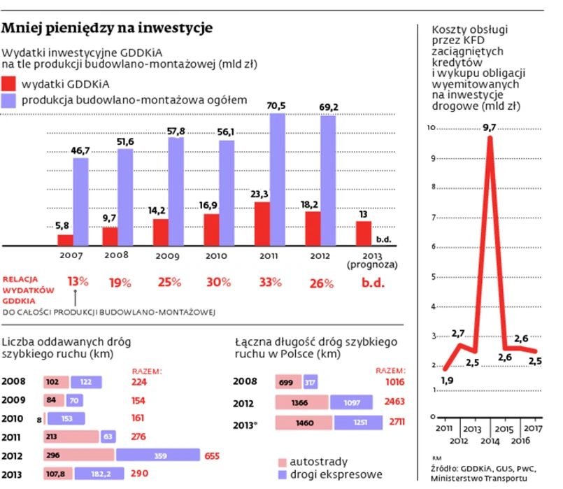 Te zaplanowane na przyszły rok też jednak nie są oszałamiające. W 2014 r. GDDKiA zamierza wydać łącznie 15,7 mld zł (z czego 12,7 mld z KFD, a resztę z budżetu). Dla porównania: w 2011 r. wydatki inwestycyjne przekroczyły 23 mld zł. Dyrekcja tłumaczy, że przyszły rok to będzie głównie czas kończenia obecnych inwestycji i podpisywania umów na nowe.