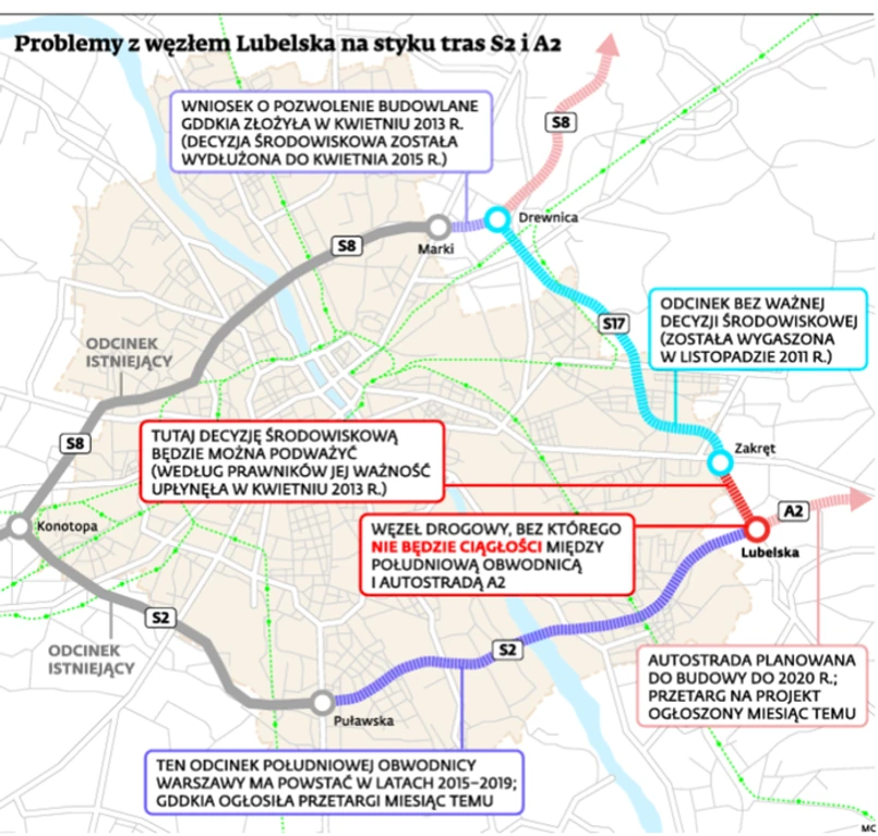 W czym problem? Węzeł Lubelska na etapie uzyskiwania zezwoleń środowiskowych był elementem wschodniej obwodnicy Warszawy. Decyzja środowiskowa dla całej tej trasy – z Marek do węzła – uzyskała ważność w kwietniu 2009 r. Na cztery lata. Z powodu błahych błędów proceduralnych w październiku 2010 r. WSA w Warszawie uchylił decyzję dla centralnego odcinka trasy (od Drewnicy do Zakrętu), a rok później Regionalna Dyrekcja Ochrony Środowiska (RDOŚ) ją wygasiła.