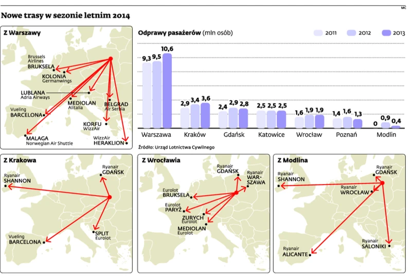 Kraków, Katowice i Warszawa potwierdzają więc niezbyt optymistyczne prognozy dla polskiego rynku lotniczego w tym roku. Ekspert lotniczy Marek Serafin, który przeprowadził dokładną analizę połączeń lotniczych w nadchodzącym sezonie, mówi wprost o „pewnej stagnacji rynkowej” oraz o „utrzymywaniu się łącznego oferowania na poziomie z sezonu lato 2013”. Podkreśla, że taki obraz rynku jest efektem kilku czynników: negatywne to ograniczanie siatki przez LOT i jej restrukturyzacja w Ryanairze, pozytywne zaś to zwiększona aktywność Lufthansy, a także kontrofensywa niegdyś największej taniej linii w Polsce, tj. WizzAira. Po miesiącach odwrotu pod naporem Ryanaira ta firma ponownie rozszerza ofertę, ale dotyczy to trzech największych dla niej baz: Gdańska, Katowic i Warszawy. Już w maju w Warszawie pojawi się czwarty samolot WizzAira. Nowa maszyna będzie obsługiwała loty na 22 trasach, dzięki czemu przewoźnik zwiększy swoją przepustowość w Warszawie o ponad 1,4 mln miejsc w 2014 r.