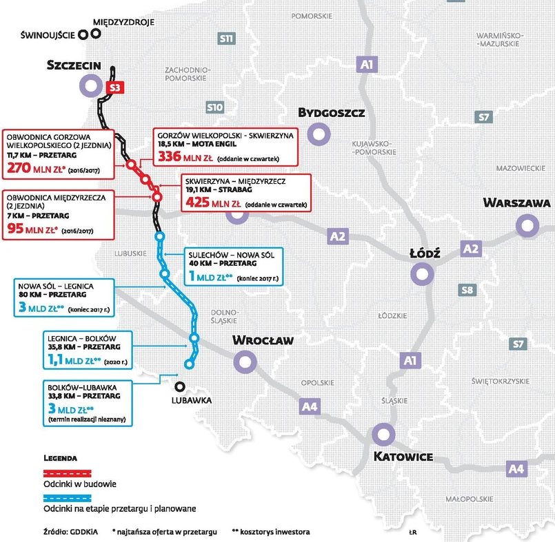 Do 2017 r. GDDKiA będzie poszerzać jednozdaniowe odcinki w obwodnicach Gorzowa Wielkopolskiego i Międzyrzecza. W obu przypadkach latem mają być podpisane umowy z wykonawcami. W planach resortu infrastruktury Elżbiety Bieńkowskiej jest też m.in. połączenie S3 do autostrady A4 w Legnicy. W resorcie są harmonogramy dla 200-kilometrowego odcinka od Sulechowa (w rejonie Zielonej Góry) do Bolkowa w okolicach Jaworzyny Śląskiej. Szczegóły pokazujemy na mapce. Szukając pieniędzy na obiecaną przez premiera Donalda Tuska południową obwodnicę Warszawa, resort wycofał się z ciągnięcia S3 do granicy z Czechami w Lubawce. Trzeba jednak przyznać, że koszty S3 pod granicą z Czechami byłby astronomiczne - sam dwukilometrowy tunel pod Górami Wałbrzyskimi pochłonąłby ok. 2 mld zł.