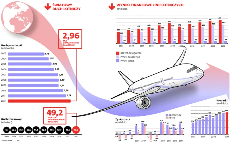 Analitycy rynkowi szacują, że w 2013 r. zysk linii lotniczych wzrośnie do 8,4 mld dol. (wcześniejsza prognoza zakładała 7,5 mld dol.). Ten pozytywny trend ma się utrzymać w najbliższych latach. W prognozach rozwoju największych producentów taboru lotniczego (Airbus Industrie i Boeing Corporation) przez następne 20 lat gospodarka globalna będzie rosnąć w tempie 3,2 proc. rocznie, a ruch lotniczy w tym czasie będzie wzrastał o około 5 proc.