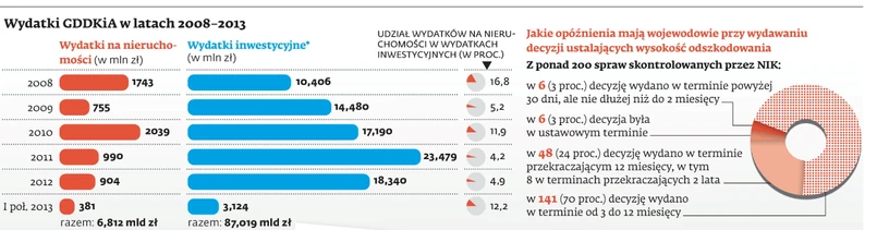 NIK jest przeciąganie w nieskończoność spraw odszkodowawczych. Teoretycznie wojewoda powinien wydać decyzję w terminie 30 dni od dnia, w którym decyzja o zezwoleniu na realizację inwestycji drogowej stała się ostateczna, lub 60 dni od nadania jej rygoru natychmiastowej wykonalności. W praktyce rzadko kiedy jest to przestrzegane. Gdy kontrolerzy wzięli pod lupę 200 takich postępowań (w urzędach wojewódzkich: lubelskim, podkarpackim, świętokrzyskim, wielkopolskim oraz mazowieckim), okazało się, że niemal w żadnym z nich nie dotrzymano terminów. Większość decyzji odszkodowawczych (141) wydano w terminie od 3 do 12 miesięcy. W skrajnych przypadkach właściciele nieruchomości czekali ponad 2 lata. Urzędnicy zazwyczaj tłumaczą się dużą ilością obowiązków i sztywnymi procedurami rozstrzygania. To jednak nie przekonuje NIK, która jest zdania, że to bardziej efekt zwłoki w rozpoczynaniu postępowań oraz nieuzasadnionych przerw w ich trakcie.