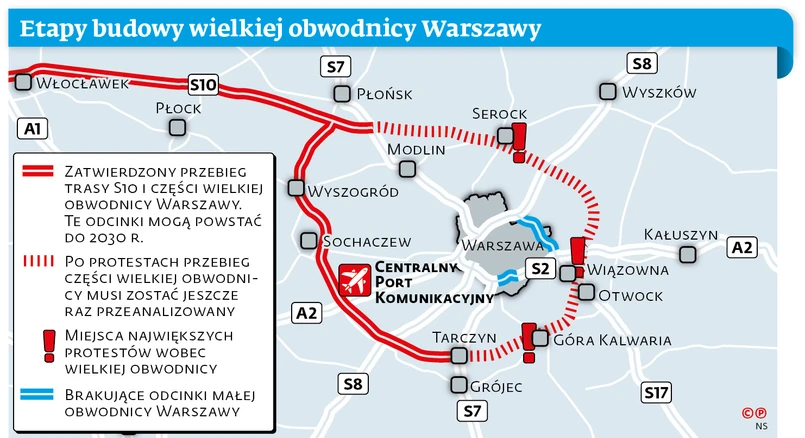 W tej sytuacji GDDKiA zamierza na dobre wystartować z przygotowaniami do budowy zachodniej części wielkiej obwodnicy Warszawy oraz trasy S10 od okolicy stolicy do połączenia z autostradą A1 w rejonie Włocławka. Jesienią zostanie ogłoszony przetarg na wykonanie studium technicznego, które wskaże precyzyjną lokalizację tych odcinków. Chodzi o zachodnią część wielkiej obwodnicy do trasy S7 wychodzącej ze stolicy na północ (w okolicach Płońska) i na południe (w okolicach Tarczyna). Drogowcy przyznają, że ta część jest nie tylko znacznie mniej konfliktowa, ale dodatkowo jej budowa jest bardziej pilna. Chodzi m.in. o dobre skomunikowanie Centralnego Portu Komunikacyjnego, który ma powstać w drugiej połowie dekady.