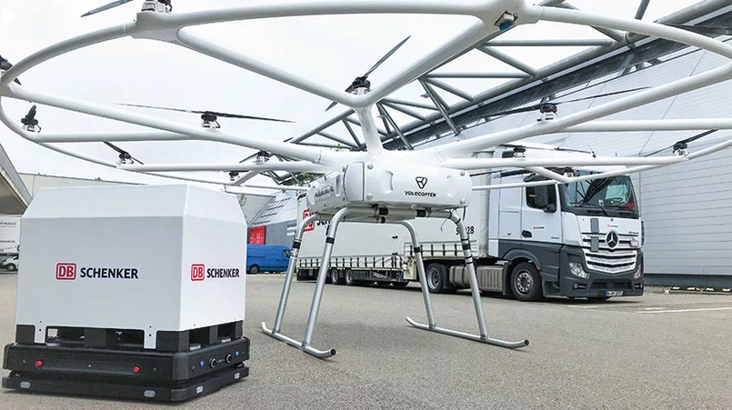 Transport i logistyka nowej generacji to także drony w łańcuchach dostaw. W październiku ubiegłego roku w Hamburgu odbył się pierwszy lot testowy drona do transportu cięższych ładunków w miejskich warunkach. To efekt współpracy DB Schenker z Volocopter – pionierem miejskiej mobilności powietrznej. Volodrone dostarczy przesyłkę o wadze nawet do 200 kg na odległość do 40 km. Podczas testu w Hamburgu dron wzbił się na wysokość 22 m, przenosząc ładunek wielkości europalety.