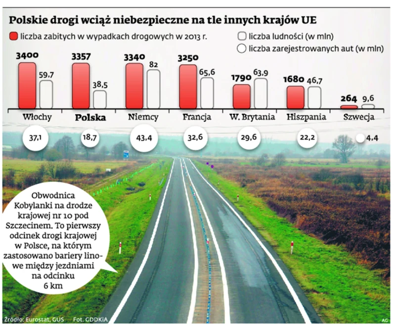 Z danych Komendy Głównej Policji wynika, że w 2013 r. na drogach jednojezdniowych, dwukierunkowych było 29 208 wypadków, co stanowi 81,5 proc. wszystkich. Zginęło 2938 osób, a 35 905 zostało rannych.