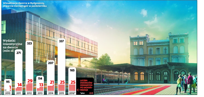 W 2016 r. liczba dworców rewitalizowanych przez spółkę matkę grupy PKP z pieniędzy własnych i unijnych będzie zbliżona do wyniku tegorocznego. Znacznie wyhamuje jednak wartość inwestycji. Według szacunków PKP wydatki sięgną ok. 165 mln zł. Będzie tak, bo para pójdzie w mniejsze obiekty.