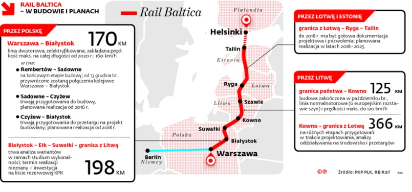 Litwa, Łotwa i Estonia powołały joint venture RB Rail, która koordynuje budowę (Polska i Finlandia uczestniczą w niej jako obserwatorzy). Litwa buduje i uchodzi w tym projekcie za prymusa, Łotwa i Estonia szykują projekty. A Polska? Mamy opinię kraju, który jest zainteresowany tylko wewnętrznym odcinkiem, i to tym blisko stolicy.