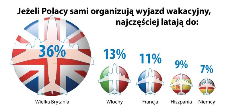 Serwis eSKY.pl dokonał analizy kierunków tegorocznych wyjazdów wakacyjnych Polaków, a także kosztów biletów lotniczych, które w związku z tymi podróżami należy ponieść. W kwestii kierunków, niewiele zmienia się od kilku lat – choć coraz więcej osób decyduje się na samodzielne organizowanie wakacji nadal wygrywają te miejsca, w których mamy rodzinę i wykorzystujemy urlop, by ją odwiedzić – króluje Wielka Brytania (36 proc.), a po niej Włochy (13 proc.), Francja (11 proc.), Hiszpania (9 proc.) i Niemcy (7 proc.).