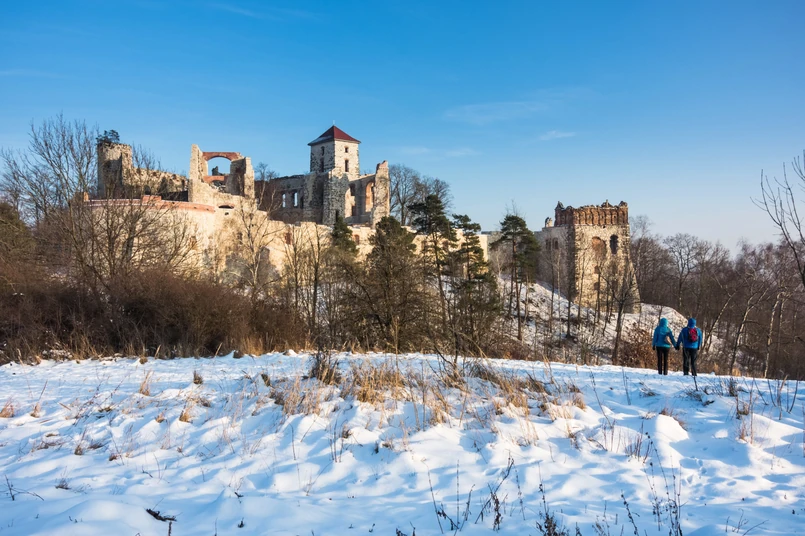4/8 4. Zamek Tenczyn. Został włączony w XIV wieku do kazimierzowskiego systemu tzw. Orlich Gniazd, Można go znaleźć we wsi Rudno w województwie małopolskim, w powiecie krakowskim, w odległości 24 km na zachód od Krakowa. To Jurajska warownia położona na wygasłym wulkanie. W latach swojej świetności wyglądem i znaczeniem konkurował z Wawelem. Zamek od lat poddawany pracom zabezpieczającym jest ponownie udostępniony dla turystów, którzy z każdym sezonem coraz liczniej go odwiedzają. W ostatnich latach stał się areną różnorodnych wydarzeń towarzyszących zwiedzaniu. Nawiązujących między innymi do historii zamku (inscenizacja obrony zamku przez “Potopem Szwedzkim”), czy geologicznej historii regionu. Najstarsze informacje Tenczynie w Rudnie pochodzą z roku 1319. Zamek wzniósł prawdopodobnie Andrzej z Morawicy, który od nazwy zamku przyjął nazwisko Tenczyński. Gotycka budowla posiadała trzy wieże okrągłe i jedną kwadratową. Dostępu do zamku broniły mury obronne oraz wieża przedbramna w formie rondla. W roku 1610 umocniono go pięciobocznymi bastionami i barbakanem. Podczas „potopu szwedzkiego” po długim oblężeniu zamek został poddany, co jednak nie uchroniło go przed złupieniem i podpaleniem. Ciekawostka, w murach zamku możemy dostrzec odciski muszli