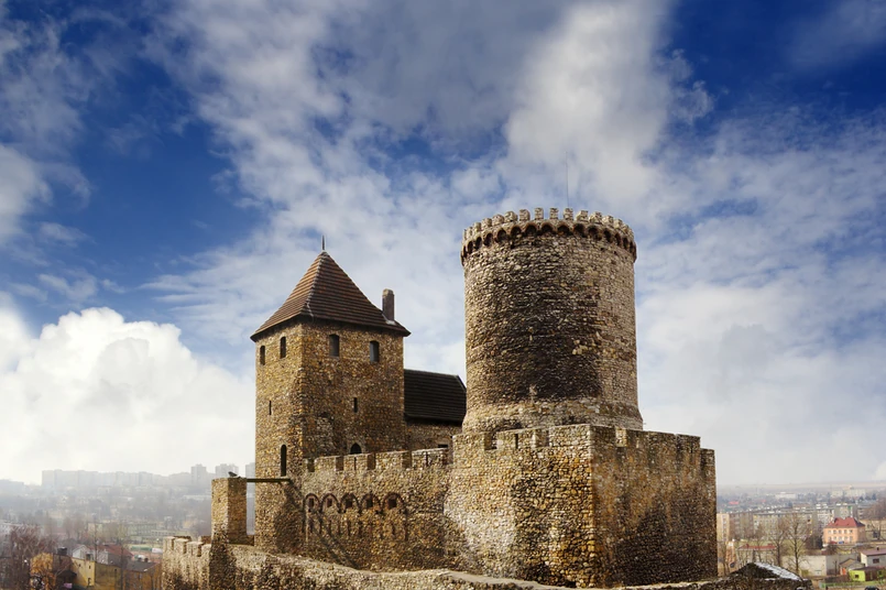 6/8 6. Zamek królewski w Będzinie. Na kamienistej górze, wśród wielkomiejskiego zgiełku przejeżdżających samochodów i tramwajów, znajduje się gotycki zamek. Zamek Będzin to przykład budownictwa obronnego z połowy XIV w. Był ważnym ogniwem systemu obronnego zachodniej granicy Polski przed najazdami od strony Śląska i Czech. Czuwał również nad bezpieczeństwem wodnych i lądowych dróg handlowych, m. in. traktu handlowego ze Śląska do Krakowa. W zamku można zobaczyć ciekawą ekspozycję dawnej broni i uzbrojenia ochronnego oraz zapoznać się z dziejami Będzina i historią obiektu. Zamek po raz pierwszy jest odnotowany w dokumentach od 1349 roku, kiedy to wymieniono Wiernka - burgrabiego będzińskiego. Wspominają o nim również Jan z Czarnkowa i Jan Długosz w spisie warownych budowli wzniesionych przez Kazimierza Wielkiego. W 1364 r. gościł tu Karol IV cesarz niemiecki i król czeski. W 1434 r. na zamku zawarto ugodę pomiędzy panami śląskimi i małopolskimi w sprawie zwalczania przygranicznych rabusiów, a w 1588 zostały tu zawarte "Pakty będzińsko - bytomskie" zobowiązujące Maksymiliana Habsburga do zrzeczenia się pretensji do tronu polskiego. W murach zamkowych gościli królowie polscy - w 1574 r. Henryk Walezy, w 1683 Jan III Sobieski, w drodze pod Wiedeń a w 1697 August II Mocny.