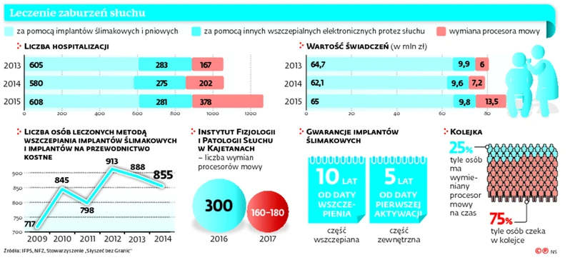 Co roku wszczepianych jest około 800 implantów. Każdy z nich mniej więcej co pięć lat wymaga wymiany zużywającego się procesora. Tymczasem z danych Funduszu wynika, że rocznie wymienia się średnio około 200. W sumie w Polsce wykonano około 10 tys. operacji (pierwsza w 1992 r.), przełomowych dla pacjentów i ich rodzin. Implant nie tylko pozwala na odbieranie dźwięków ze świata zewnętrznego, ale przede wszystkim wyciąga chorych ze społecznej izolacji.