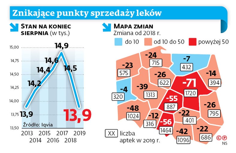 Marcin Gawroński, dyrektor ds. współpracy z aptekami w firmie analitycznej IQVIA, dodaje, że kurczenie się rynku ma nie tylko ekonomiczne podłoże, ale też organizacyjne i strukturalne. Chodzi o konsolidację i optymalizację sieci aptek czy rozwój biznesu w internecie. Do tego dochodzą kwestie regulacyjne, czyli zwiększenie kontroli i ograniczenie eksportu równoległego. Zamykane są także szpitalne apteki, których nie chce nikt kupić.