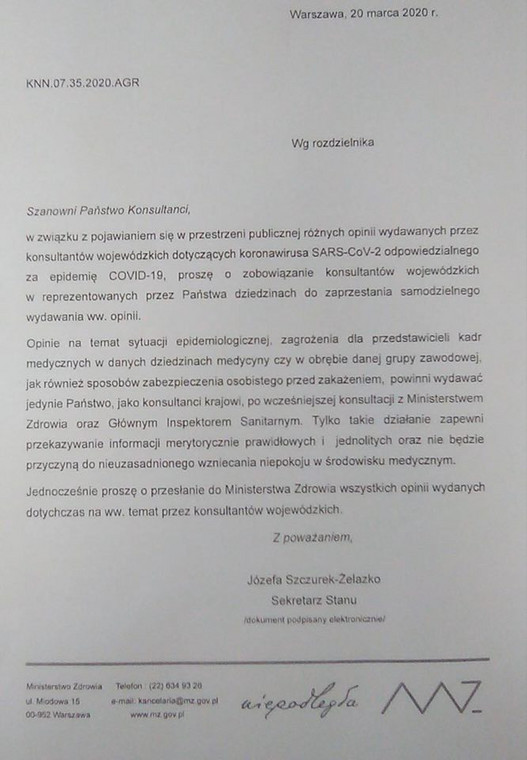 Już po odesłaniu gazety do druku otrzymaliśmy zdjęcie dokumentu, który przeczy słowom rzecznika prasowego. Jest to list, który został wysłany do konsultantów krajowych podpisany przez Sekretarz Stanu w Ministerstwie Zdrowia Józefę Szczurek- Żelazko. Prosi on, by konsultanci krajowi wpłynęli na konsultantów wojewódzkich, by ci "zaprzestali samodzielnego wydawania opinii". Jak pisze opinie takie (również w zakresie dostępności środków ochrony osobistej) powinny być, zdaniem Józefy Szczurek-Żelazko, wydawane przez konsultantów krajowych po konsultacji z ministerstwem i GIS. "Tylko takie działanie zapewni przekazywanie informacji merytorycznie prawidłowych i jednolitych oraz nie będzie przyczyną do nieuzasadnionego wzniecania niepokoju w środowisku medycznym" - czytamy w liście.
