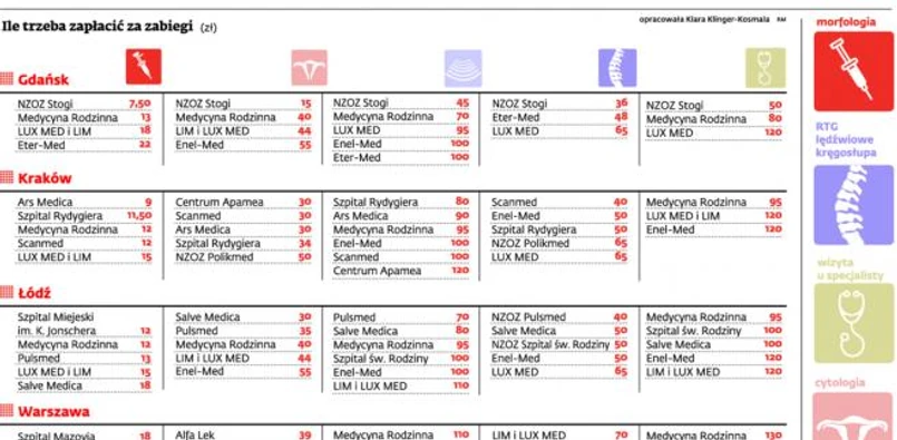 Nawet w sieci placówek Enel-Med, gdzie ceny za wybrane usługi są takie same, wyjątkiem jest Warszawa – tu automatycznie wzrastają o kilkadziesiąt złotych. Duże zróżnicowanie cen widać także w reszcie kraju. Na przykład wizyta u specjalisty w warszawskim prywatnym szpitalu Mazovia to 200 zł; za taką samą usługę płaci się średnio w reszcie kraju około 100 zł, a w Gdańsku można nawet za 50 zł. To właśnie tu, jak wynika z naszej sondy, można wykonać najtańsze badania. Za Gdańskiem uplasował się Wrocław. Ceny są o kilkadziesiąt złotych niższe niż w innych dużych miastach.