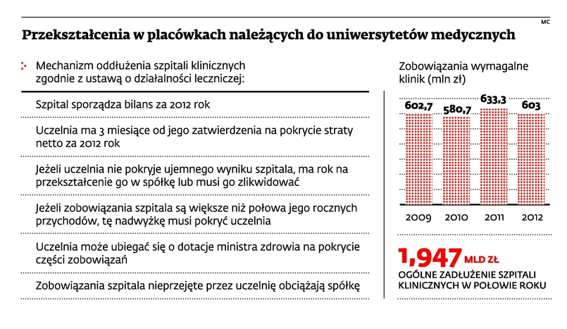 Zgodnie bowiem z ustawą z 15 kwietnia 2011 r. o działalności leczniczej (Dz.U. nr 112, poz. 654 z późn. zm.) rektorzy już w przyszłym roku musieliby przejąć na siebie odpowiedzialność za długi swoich szpitali (spłacić ich bieżące straty za 2012 rok lub pokryć część zobowiązań w przypadku przekształcenia ich w spółki). Uczelni na to nie stać.