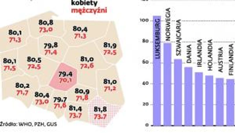 – Różnica między długością życia kobiet i mężczyzn się pogłębia. Jeszcze w latach 50. wynosiła 5 lat, obecnie jest to 8 – mówi Paweł Goryński z Zakładu-Centrum Monitorowania i Analiz Stanu Zdrowia Ludności, jeden z autorów raportu PZH. Zaś różnica w długości życia kobiet i mężczyzn w zdrowiu, czyli kiedy nie pojawiają się żadne dolegliwości, zalicza się do największych w Europie. Co ciekawe, zróżnicowanie pod tym kątem jest widoczne nie tylko w samej Europie, lecz jest także bardzo wyraźne wewnątrz kraju. Najkrócej żyją mieszkańcy małych miasteczek poniżej 5 tys. (nawet o 3,5 roku krócej niż reszta kraju) oraz województwa łódzkiego. Tu (łącznie z samą Łodzią) jest fatalnie. Mężczyźni umierają przed siedemdziesiątką, a kobiety nie dożywają 80 lat. Z kolei w województwie lubelskim panowie umierają blisko 10 lat wcześniej niż kobiety. Najbardziej egalitarne jest Opolskie – mężczyźni żyją podobnie długo jak kobiety. Małopolska i Podkarpacie to z kolei regiony względnej długowieczności.