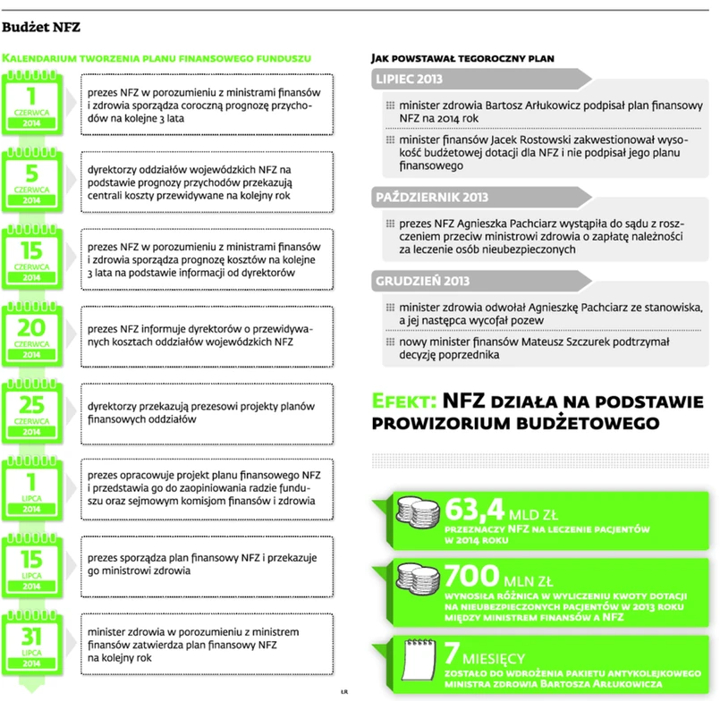 Fundusz nie mógł jednak czekać na efekty pracy ministerialnych urzędników. Musiał rozpocząć prace nad planem finansowym na 2015 rok. Nie znając wysokości dotacji, miał w efekcie problemy z przygotowaniem prognozy przychodów. Ten dokument jest zaś podstawą do przygotowania planu przyszłych wydatków przez oddziały wojewódzkie NFZ. Ich dyrektorzy mieli na to czas do 5 czerwca. Żaden z oddziałów, do którego wystąpiliśmy z pytaniem, czy dokumenty te powstały na czas, nie udzielił DGP odpowiedzi.