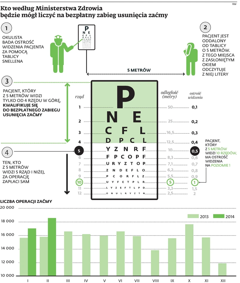 Ministerstwo Zdrowia nie tylko tylnymi drzwiami ogranicza koszyk świadczeń gwarantowanych, ale za jednym zamachem zamyka możliwość usuwania zaćmy za granicą. Nowe kryteria kwalifikowania do takiej operacji znalazły się w projekcie rozporządzenia ministra zdrowia, zmieniającego rozporządzenie w sprawie świadczeń gwarantowanych z zakresu lecznictwa szpitalnego, który jest w trakcie konsultacji społecznych. Zgodnie z tym aktem Narodowy Fundusz Zdrowia będzie opłacał usunięcie zaćmy tylko u osób, u których ostrość widzenia nie przekroczy 0,4.