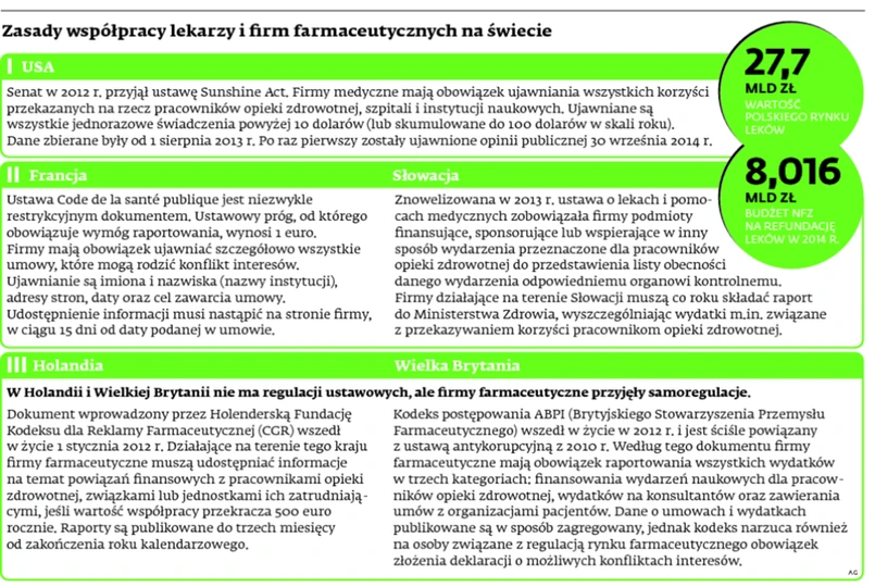 Po serii bardzo wysokich kar (sięgających nawet 3 mld dolarów) nakładanych w USA na koncerny farmaceutyczne za korumpowanie medyków od roku obowiązuje tam ustawa, która przewiduje ujawnianie wszystkich korzyści od firm o wartości ponad 10 dol. Własne regulacje wprowadziło europejskie stowarzyszenie innowacyjnych firm farmaceutycznych. Od 2016 r. zaś podobne rozwiązania zamierza wdrożyć w Polsce – Związek Pracodawców Innowacyjnych Firm Farmaceutycznych „Infarma”.