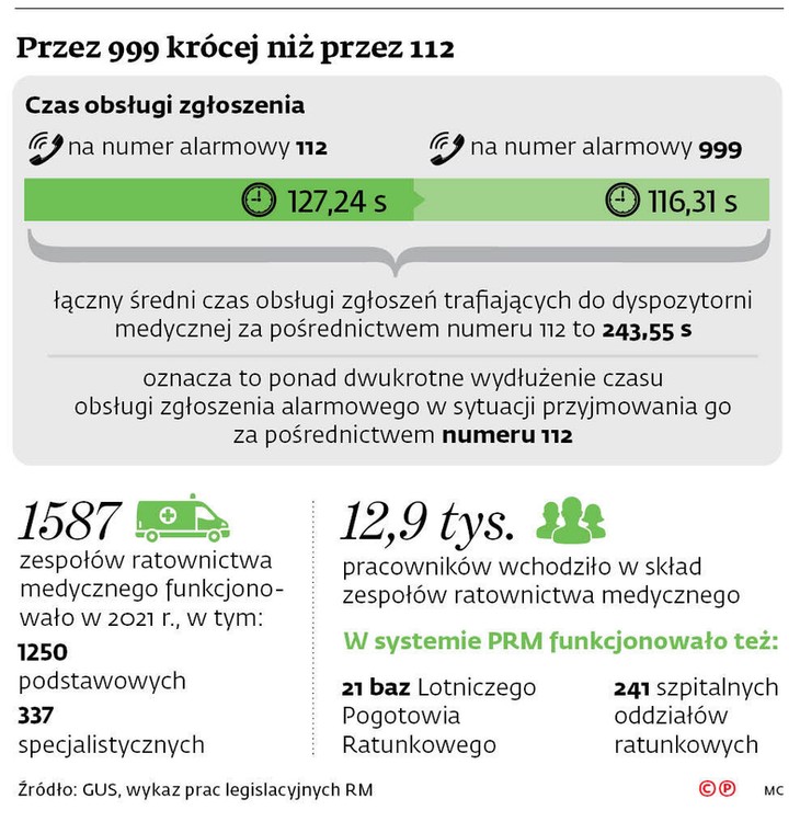Skróceniu czasu obsługi zgłoszenia ma także służyć utrzymanie - bezterminowo - możliwości kierowania połączeń alarmowych z numeru 999 bezpośrednio do dyspozytorni medycznych, z pominięciem centrów powiadamiania ratunkowego. Obecne brzmienie ustawy o PRM (Dz.U. z 2021 r. poz. 2153 i 2459) przewiduje kierowanie do centrów wszystkich połączeń telefonicznych z numeru 999 od 2024 r. Resort uznał jednak, że wydłużyłoby to znacznie czas obsługi zgłoszeń, a w konsekwencji również czas, w jakim pacjent otrzyma pomoc medyczną (potwierdzają to analizy - patrz infografika). Dlatego trzeba utrzymać możliwość bezpośredniego dodzwonienia się do dyspozytorni medycznej przez osoby wzywające pomocy.