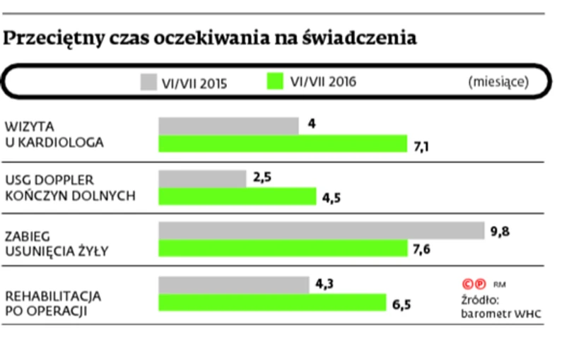 Niezmiennie najdłużej pacjenci muszą czekać na świadczenia w dziedzinie ortopedii i traumatologii narządu ruchu – średnio 16,7 miesiąca. Drugi najdłuższy czas oczekiwania na świadczenia odnotowano w stomatologii – 8,5 miesiąca. Najgorzej spośród konkretnych świadczeń wypadała artrografia stawu biodrowego. Badanie to należy do zakresu zagwarantowanego wszystkim ubezpieczonym „koszyka”, ale czeka się na nie średnio 17,6 miesiąca. Długie okresy oczekiwania są też na badania, np. rezonans magnetyczny kręgosłupa (8 miesięcy) i głowy (7,5 miesiąca). Na wykonanie echa serca dziecka czeka się ponad 4 miesiące.