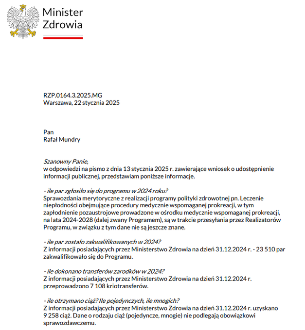 Ministerstwo Zdrowia ujawniło, że do programu zakwalifikowało się 23,5 tys. par i wykonano w tym czasie 7108 kriotransferów, z których uzyskano 9258 ciąż. "Z informacji posiadanych przez Ministerstwo Zdrowia na dzień 31.12.2024 r. 23 510 par zakwalifikowało się do Programu" - pisze ministerstwo. I dodaje: "Z informacji posiadanych przez Ministerstwo Zdrowia na dzień 31.12.2024 r. uzyskano 9 258 ciąż. Dane o rodzaju ciąż (pojedyncze, mnogie) nie podlegają obowiązkowi sprawozdawczemu"